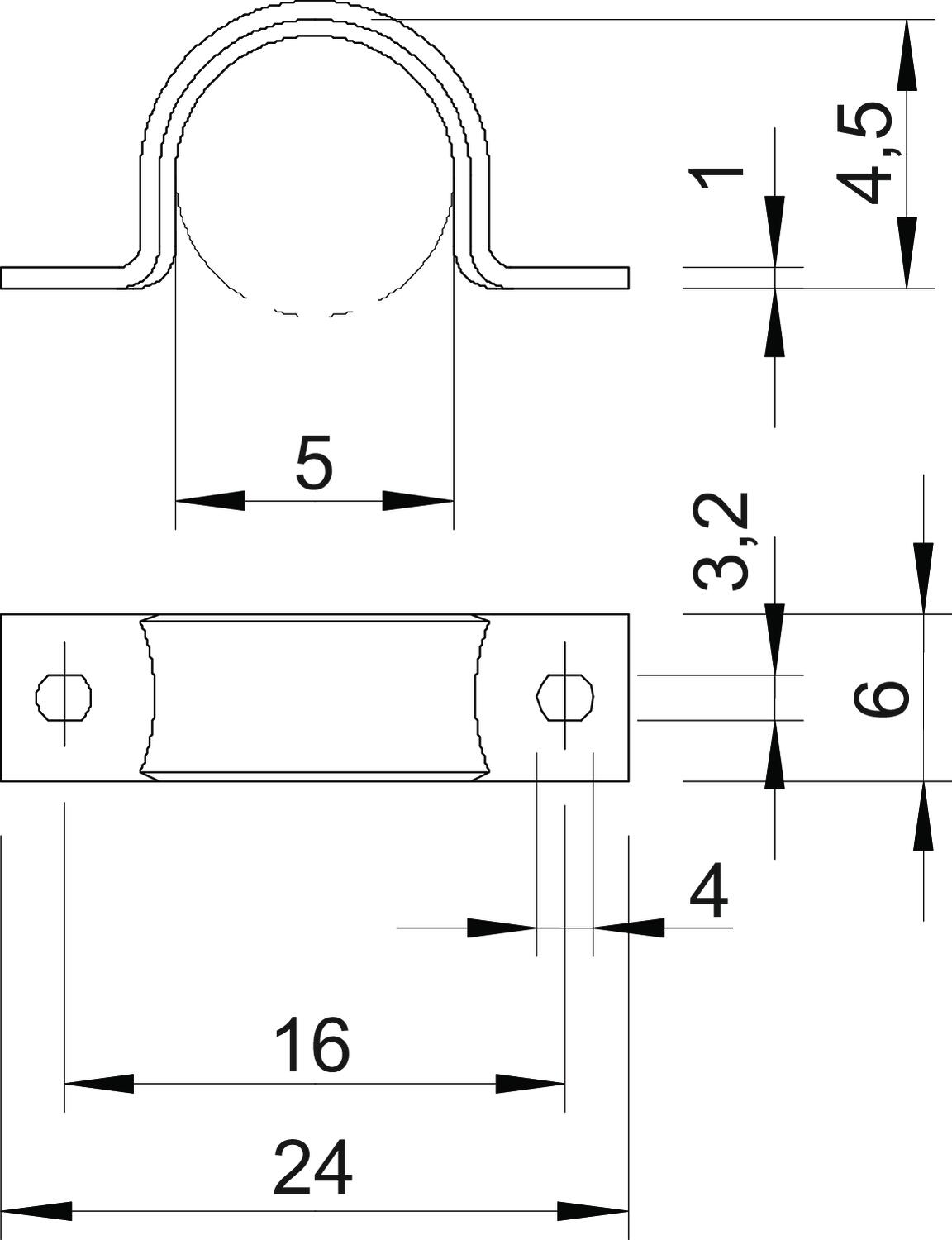 CO2 Footprint (GWP) Cradle-to-Gate 0,0032 kg CO2e / 1 Piece Dimension 5mm Dimension A 24 mm Dimension b 6 mm Dimension B 16 mm Dimension D 5 mm Dimension d 3,2 mm Dimension e 4 mm Dimension H 4,5 mm Dimension L 24 mm Dimension t 1 mm Distance to the wall no Fastening type Screw hole For diameter 5 Halogen-free yes Height 4,5 mm Hole size 3,2 x 4 mm Length 24 mm Material Steel Material thickness 1 mm Nominal diameter 5 mm Number of cables/pipes 1 Plastic-covered no Suitable in fire protection area no Surface Electrogalvanized, transparently passivated UV-resistant yes Version for Two-lobe Width 6 mm - All types