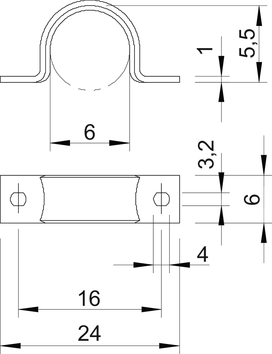 CO2 Footprint (GWP) Cradle-to-Gate 0,0034 kg CO2e / 1 Piece Dimension 6mm Dimension A 24 mm Dimension B 16 mm Dimension b 6 mm Dimension D 6 mm Dimension d 3,2 mm Dimension e 4 mm Dimension H 5,5 mm Dimension L 24 mm Dimension t 1 mm Distance to the wall no Fastening type Screw hole For diameter 6 Halogen-free yes Height 5,5 mm Hole size 3,2 x 4 mm Length 24 mm Material Steel Material thickness 1 mm Nominal diameter 6 mm Number of cables/pipes 1 Plastic-covered no Suitable in fire protection area no Surface Electrogalvanized, transparently passivated UV-resistant yes Version for Two-lobe Width 6 mm - All types
