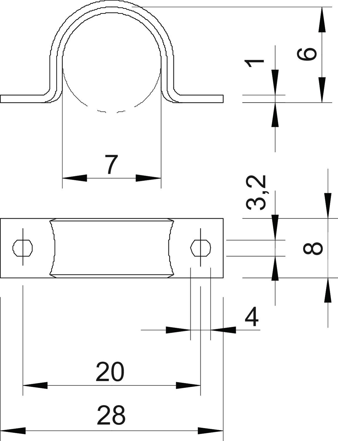 CO2 Footprint (GWP) Cradle-to-Gate 0,0049 kg CO2e / 1 Piece Dimension 7mm Dimension A 28 mm Dimension b 8 mm Dimension B 20 mm Dimension D 7 mm Dimension d 3,2 mm Dimension e 4 mm Dimension H 6 mm Dimension L 28 mm Dimension t 1 mm Distance to the wall no Fastening type Screw hole For diameter 7 Halogen-free yes Height 6 mm Hole size 3,2 x 4 mm Length 28 mm Material Steel Material thickness 1 mm Nominal diameter 7 mm Number of cables/pipes 1 Plastic-covered no Suitable in fire protection area no Surface Electrogalvanized, transparently passivated UV-resistant yes Version for Two-lobe Width 8 mm - All types