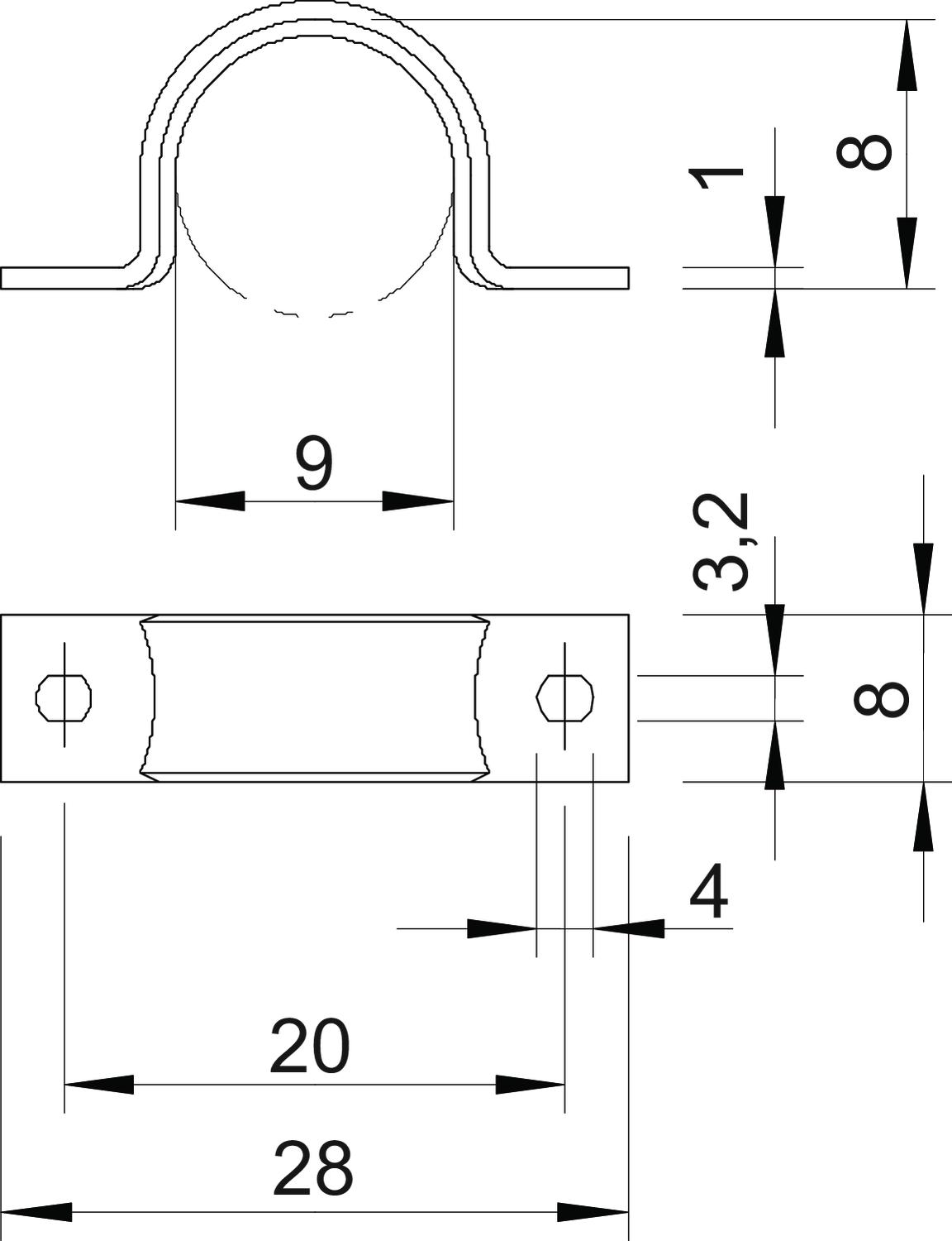 CO2 Footprint (GWP) Cradle-to-Gate 0,0052 kg CO2e / 1 Piece Dimension 9mm Dimension A 28 mm Dimension B 20 mm Dimension b 8 mm Dimension D 9 mm Dimension d 3,2 mm Dimension e 4 mm Dimension H 8 mm Dimension L 28 mm Dimension t 1 mm Distance to the wall no Fastening type Screw hole For diameter 9 Halogen-free yes Height 8 mm Hole size 3,2 x 4 mm Length 28 mm Material Steel Material thickness 1,5 mm Nominal diameter 9 mm Number of cables/pipes 1 Plastic-covered no Suitable in fire protection area no Surface Electrogalvanized, transparently passivated UV-resistant yes Version for Two-lobe Width 8 mm - All types