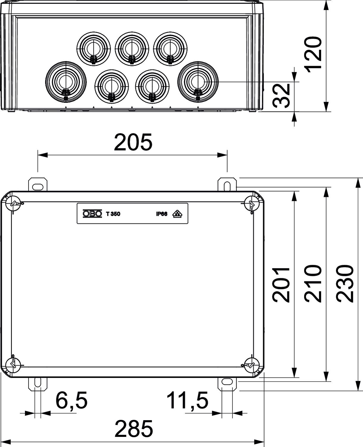Clear internal dimensions 267x182x110 mm CO2 Footprint (GWP) Cradle-to-Gate 5,694 kg CO2e / 1 Piece Colour Pastel orange; RAL 2003 Cover Not transparent Cover fastening Screwed Dimension 285x201x120 Dimension B 201 mm Dimension H 120 mm Dimension L 285 mm Dimension L1 205 mm Dimension L2 230 mm Entry from rear no Equipment Terminal Expandable no Explosion-tested version no For Ex zone Without For Ex zone dust Without For Ex zone gas Without Halogen-free yes Height 120 mm Impact-resistant no Length 285 mm Maintain electrical functions E 90 Material Polypropylene No. of entries 10 Nominal cross-section, max. 4 mm² Nominal cross-section, min. 0,5 mm² Nominal voltage 660 V Number of terminals 36 Protection rating IP66 Protective terminal 4 Sealable no Shape Rectangular Single terminals 32 Transparent lid no Type of housing penetration Cuttable stepped membrane Weatherproof no Width 201 mm with lid yes With screening no - All types