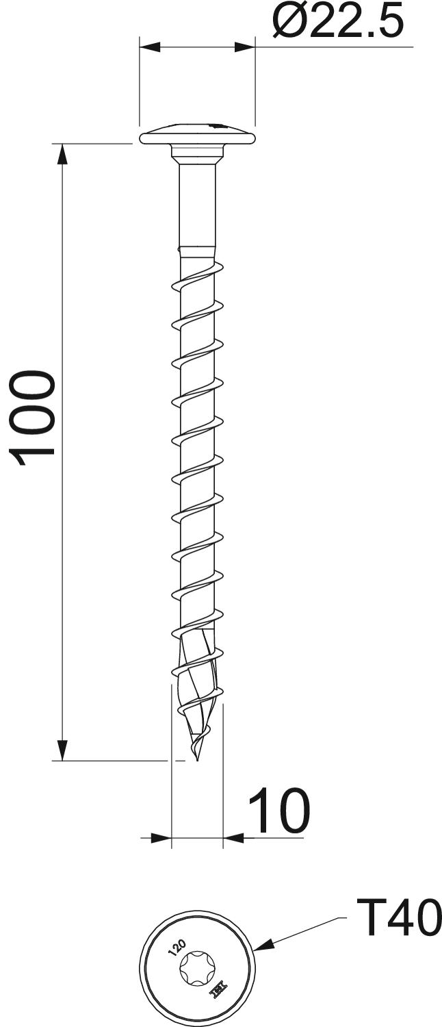 Colour zinc Dimension 10x100 Dimension D 10 mm Dimension L 100 mm Hardened yes Head diameter 22,5 mm Head shape Plate head Length 100 mm Material Steel Screw system Torx Shank diameter 7 mm Surface Electrogalvanized Two-compartment no - All types