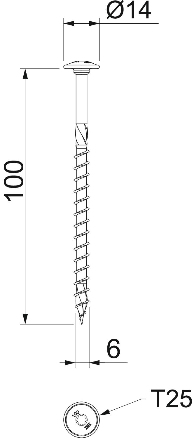 Colour zinc Dimension 6x100 Dimension D 6 mm Dimension L 100 mm Hardened yes Head diameter 14 mm Head shape Plate head Length 100 mm Material Steel Screw system Torx Shank diameter 4,5 mm Surface Electrogalvanized Two-compartment no - All types