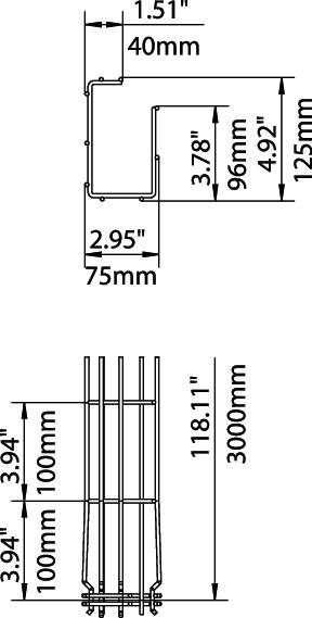 CO2 Footprint (GWP) Cradle-to-Gate 5,4826 kg CO2e / 1 Meter Colour stainless steel Connector version Integrated connector Dimension 125x75x3000 Dimension A 96 mm Dimension B 75 mm Dimension C 38 mm Dimension H 125 mm Height 125 mm Height 4,92 in Integrated partition Without Length 3000 mm Load test type according to IEC 61537 Type II Maintain electrical functions no Material Stainless steel 1.4301 Profile shape G-shaped Rustproof steel, pickled yes Screwless connector yes Support spacing 1.0 m 0,6 kN/m Support spacing 1.5 m 0,35 kN/m Support spacing 2.0 m 0,3 kN/m Support spacing 2.5 m 0,25 kN/m Surface Bright, treated Type of connector, cable support system Click fastening Usable cross-section 6100 mm² Usable cross-section 61 cm² Wide-span version no Width 75 mm Width 2,95 in Wire diameter 3,9 mm - All types