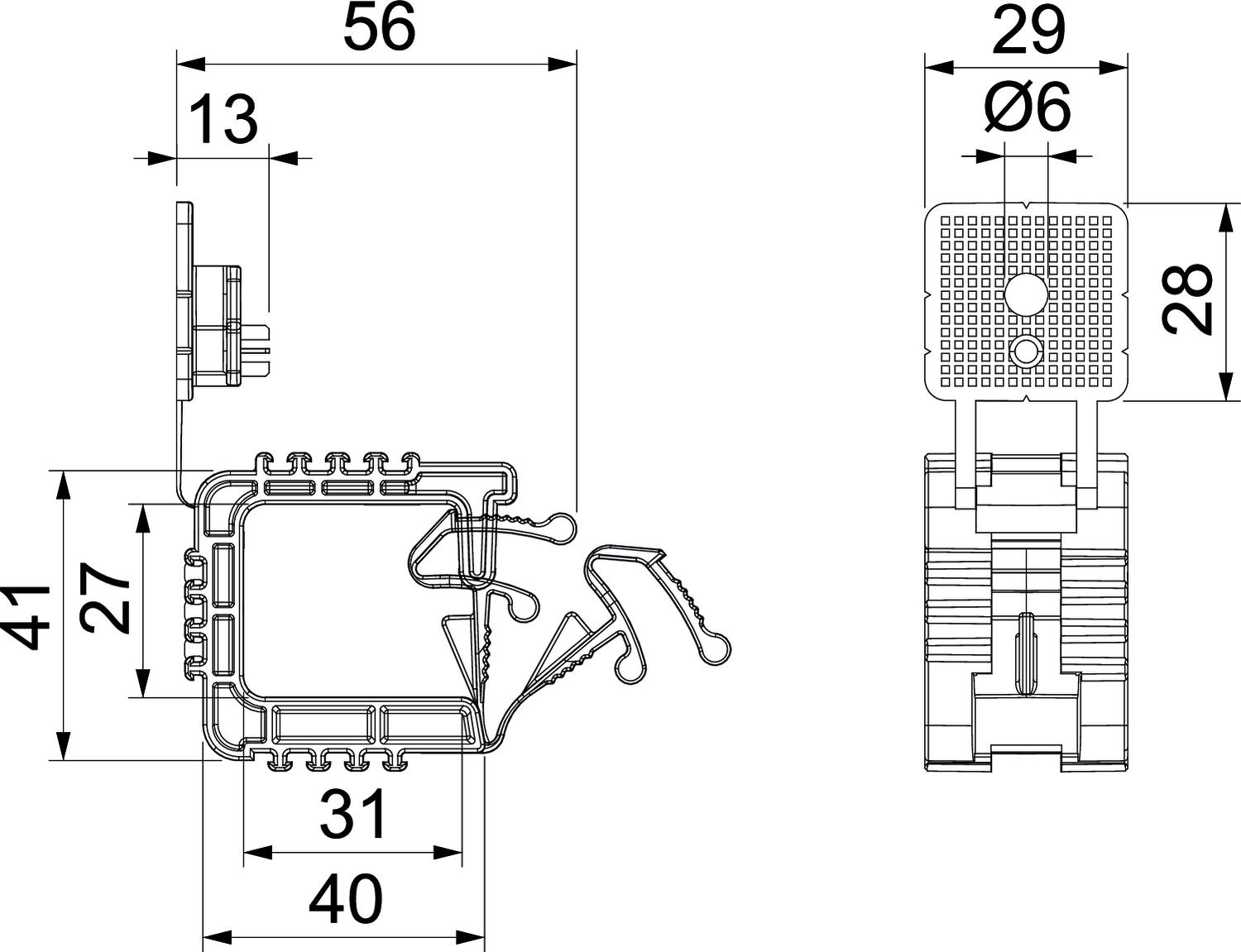 Product descriptionCable tidy for general use with fastening holes of Ø 6 mm, suitable for wall and ceiling mounting. The moulded fastening element can be fastened using knock-in anchors or a gas pressure nail gun. The recommended fastening spacing when assigned fully is 50 to 60 cm.