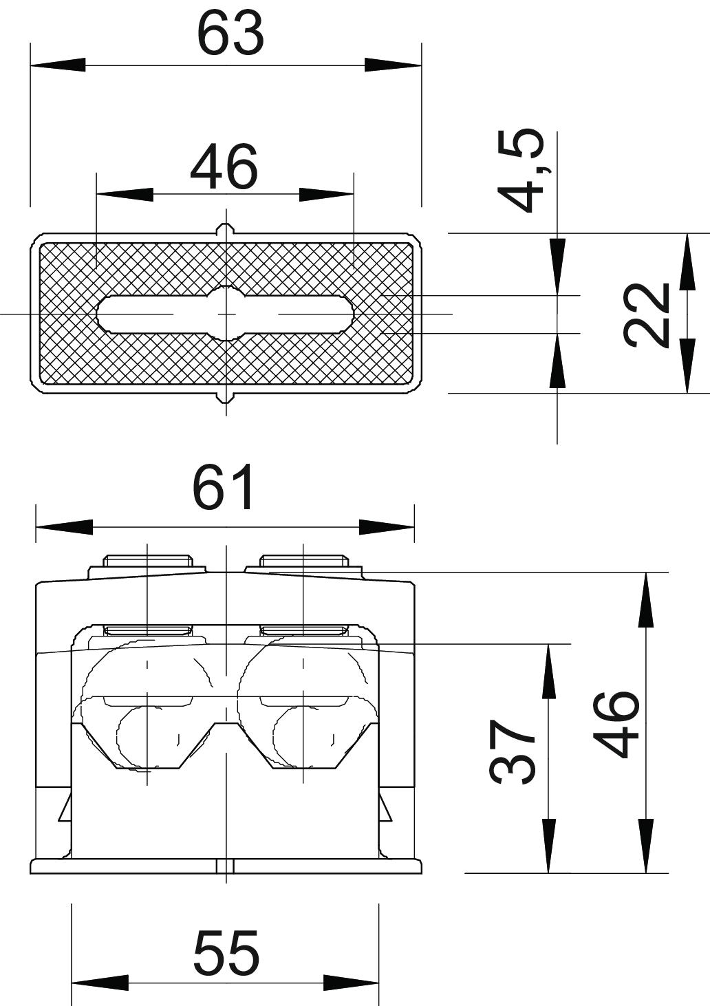 Clamping range D, max. 24 mm Clamping range D, min. 16 mm CO2 Footprint (GWP) Cradle-to-Gate 0,0817 kg CO2e / 1 Piece Colour Light grey; RAL 7035 Dimension 16-24mm Dimension a 63 mm Dimension a1 (mm) 46 mm Dimension b 22 mm Dimension b1 4,5 mm Dimension c 61 mm Dimension d 37 mm Dimension e 46 mm Dimension f 55 mm Expandable no Fastening type Screw hole Halogen-free yes Impact-resistant yes Material Polystyrene Number of cables/pipes 2 - All types