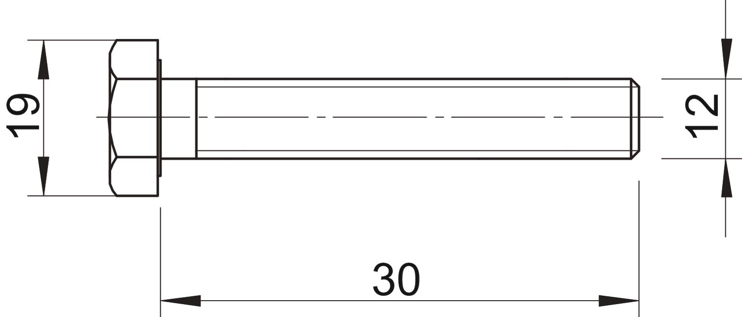 CO2 Footprint (GWP) Cradle-to-Gate 0,0747 kg CO2e / 1 Piece Dimension M12x30 Dimension d 12 mm Dimension L 30 mm Full thread yes Left thread no Length 30 mm Material Steel Resistance grade 8.8 Screw system Hexagonal Self-locking no Surface Zinc slat Thread M12 Thread length 30 mm Thread metric 12 Thread type Metric WAF 19 With flange no With nut no With washer no - All types