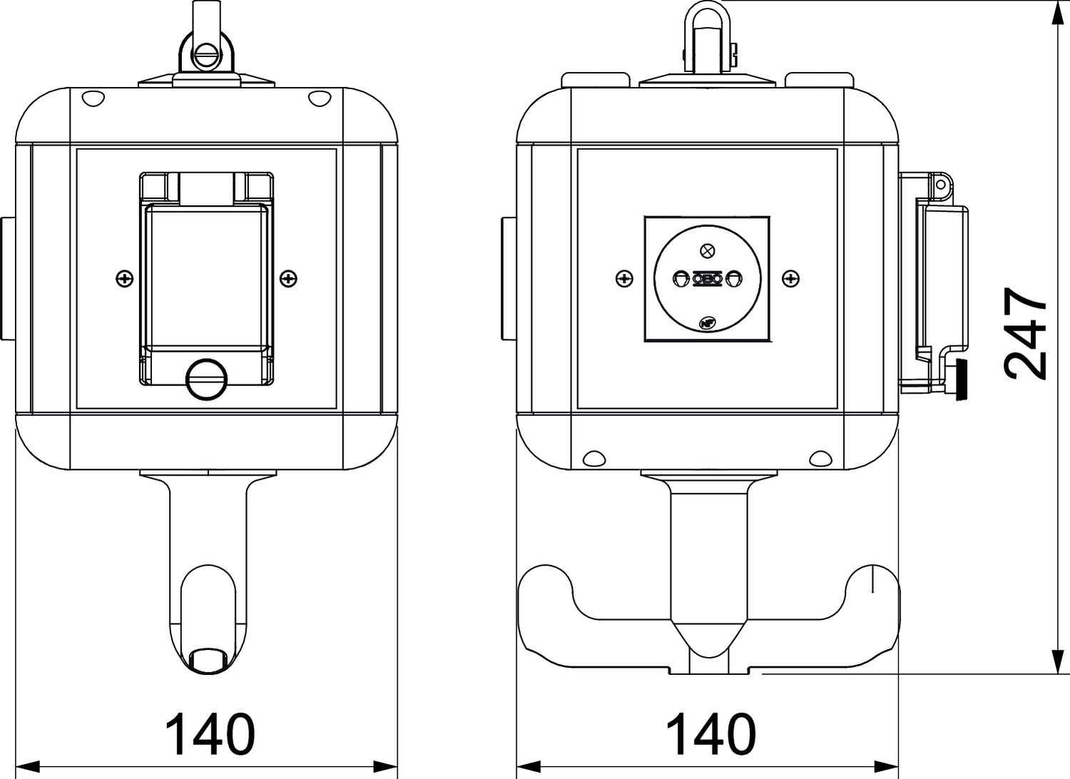 2 x single NF sockets with earthing pin 16 A/250 V with increased touch protection, prewired for an AC current, connection via 1x 3-pin terminal, with partition for circuit separation and an FI/LS switch.