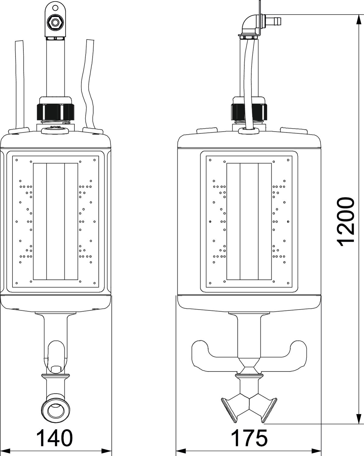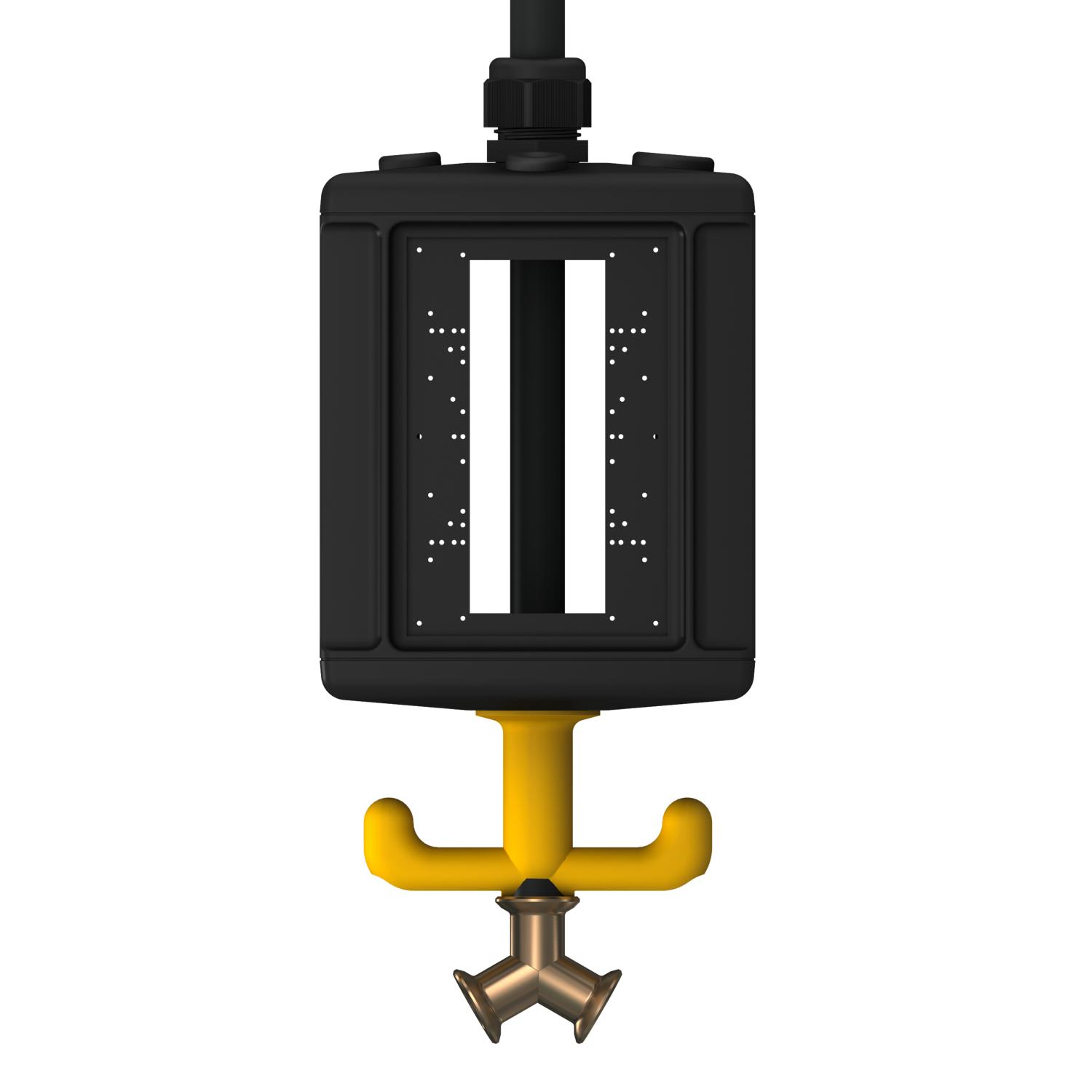 Product descriptionEmpty housing with 1 m pipe 1/2" and connection for compressed air hose 13 x 3.5 mm and 2-way distributor 1/2". With suspension lug and grip hook, for the installation of electrical resources, with included partition. Without cover plates to supply workplaces in wet areas. Protection rating: IP44.