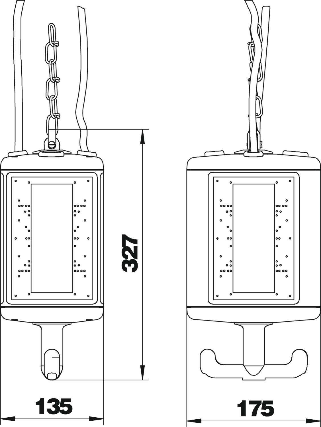 Product descriptionEmpty housing with suspension lug and grip hook, for the installation of electrical resources, with included partition. Without cover plates to supply workplaces in wet areas. Protection rating: IP44.
