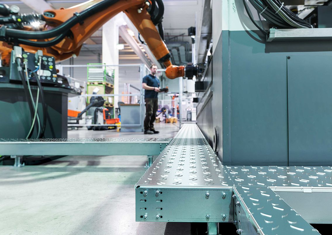 The cable ducts with covers are designed for the highest loads, which frequently occur in the vicinity of machines and automated production systems with robotic systems. The cable ducts are available with the side heights 100 mm and 110 mm. Six different widths between 100 and 600 mm offer the right cable duct for any purpose in areas such as machining, mounting and production. The dimensions and materials of the walkable cable tray system mean that they satisfy the guidelines and requirements of different industries, for example countless car manufacturers. Major players such as BMW and VW already use the walkable cable trays from OBO.