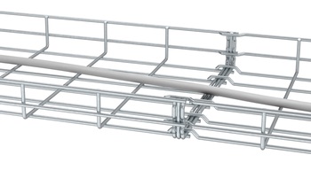 Components such as bends, side holders, mounting plates, quick connectors and clamping pieces complete the easy-to-mount system. The cover is fastened by simply attaching the type DKU cover clamp to the transverse wire of the mesh cable tray.