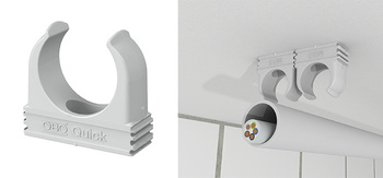 The OBO Quick series offers three different types of halogen-free pressure and pipe clips for the time-saving and secure fastening of cables and electrical installation pipes.