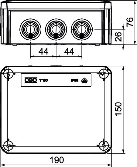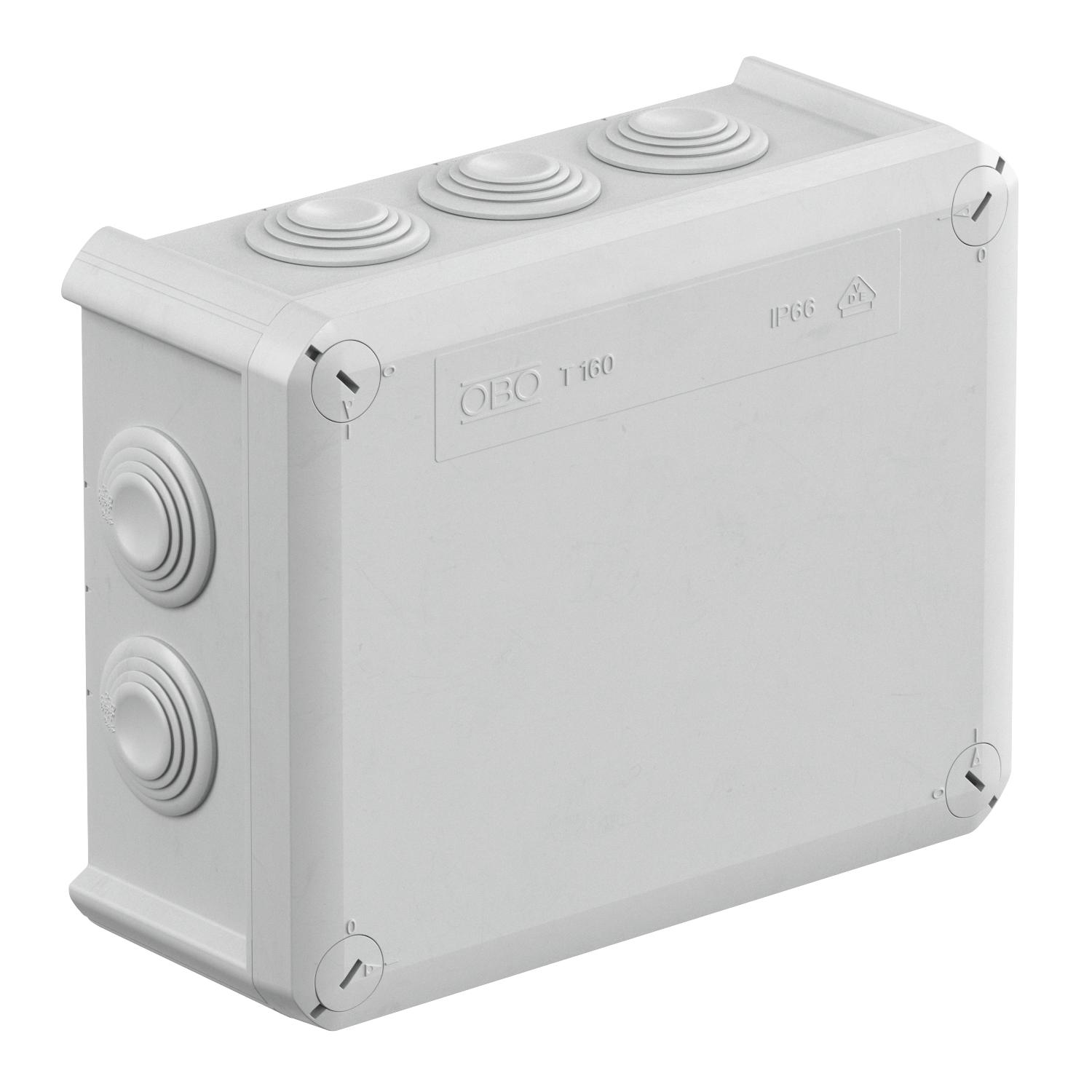Product descriptionJunction box for the connection of cables and lines indoors and in protected outdoor areas. Rectangular design with plug-in seals to the sides and knock-out entries in the bottom. Suitable for wall and ceiling mounting and on mounting panels. With the option to fasten inside and to mount via the corner domes. Cover with quick lock, sealable. Made from halogen-free and UV-resistant materials.