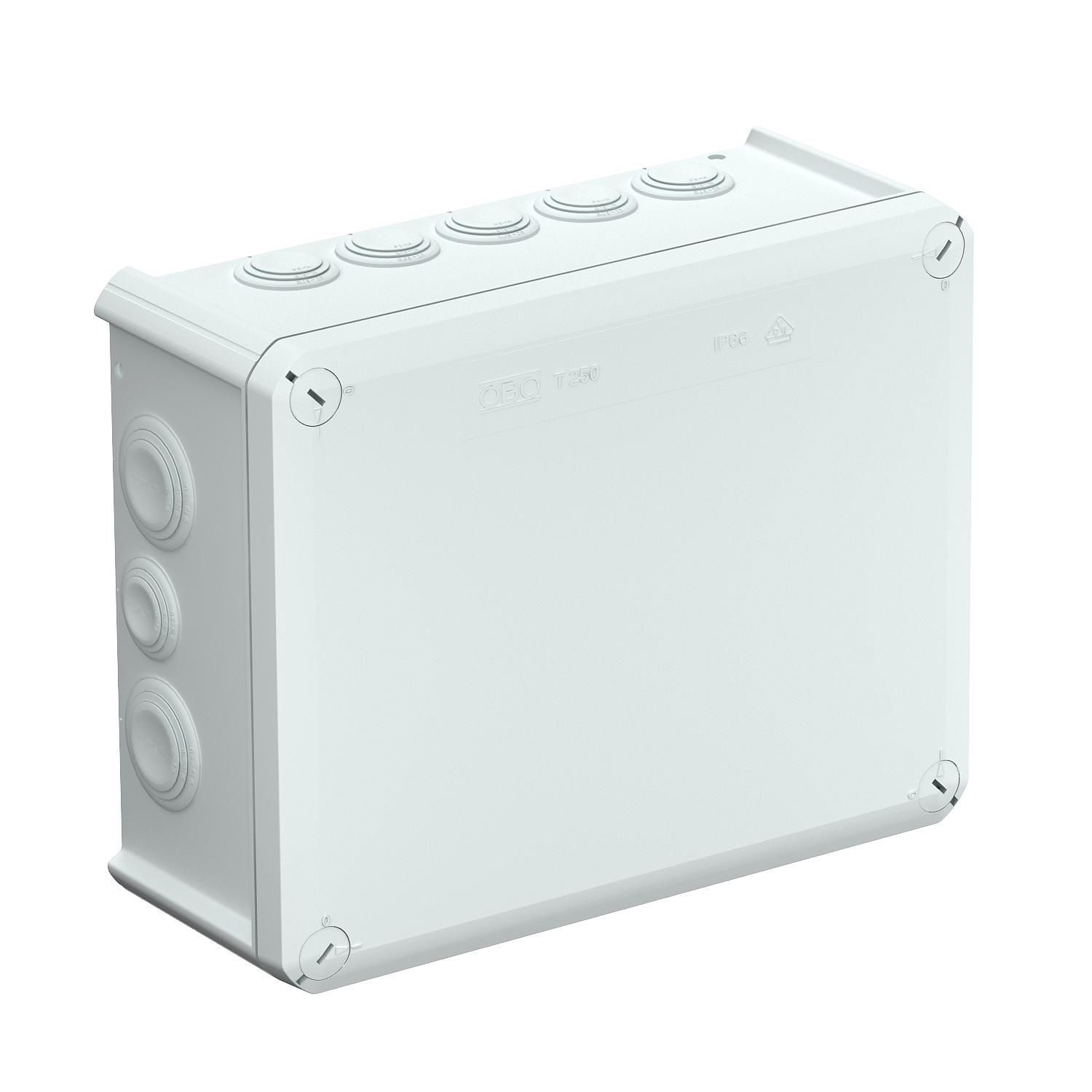 Product descriptionJunction box for the connection of cables and lines indoors and in protected outdoor areas. Rectangular design with plug-in seals to the sides and knock-out entries in the bottom. Suitable for wall and ceiling mounting, on mounting panels and threads in the floor. With the option to fasten inside and to mount via the corner domes. Cover with quick lock, sealable. Made from halogen-free and UV-resistant materials. Junction box according to DIN EN 60670. Flame-resistant to DIN EN 60695/2/11, test temperature 650 °C. Impact resistance IK05 according to DIN EN 50102.