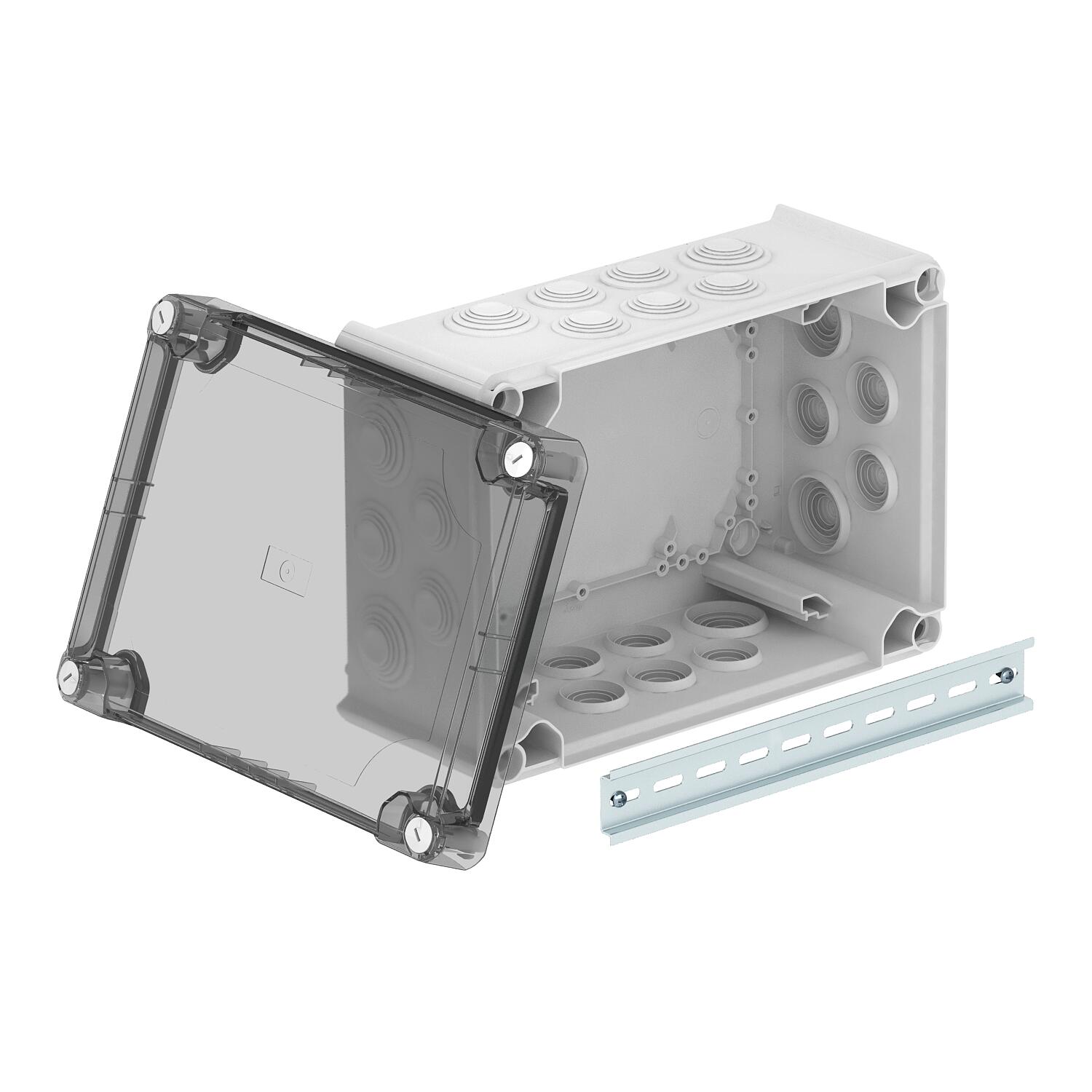 Product descriptionJunction box for the connection of cables indoors and in protected outdoor areas. Rectangular design with plug-in seals. Suitable for wall and ceiling mounting, on mounting panels and threads in the floor. With the option of fastening inside and to mount via the corner domes. High, transparent cover with quick lock, sealable. Made from halogen-free, UV-resistant materials.