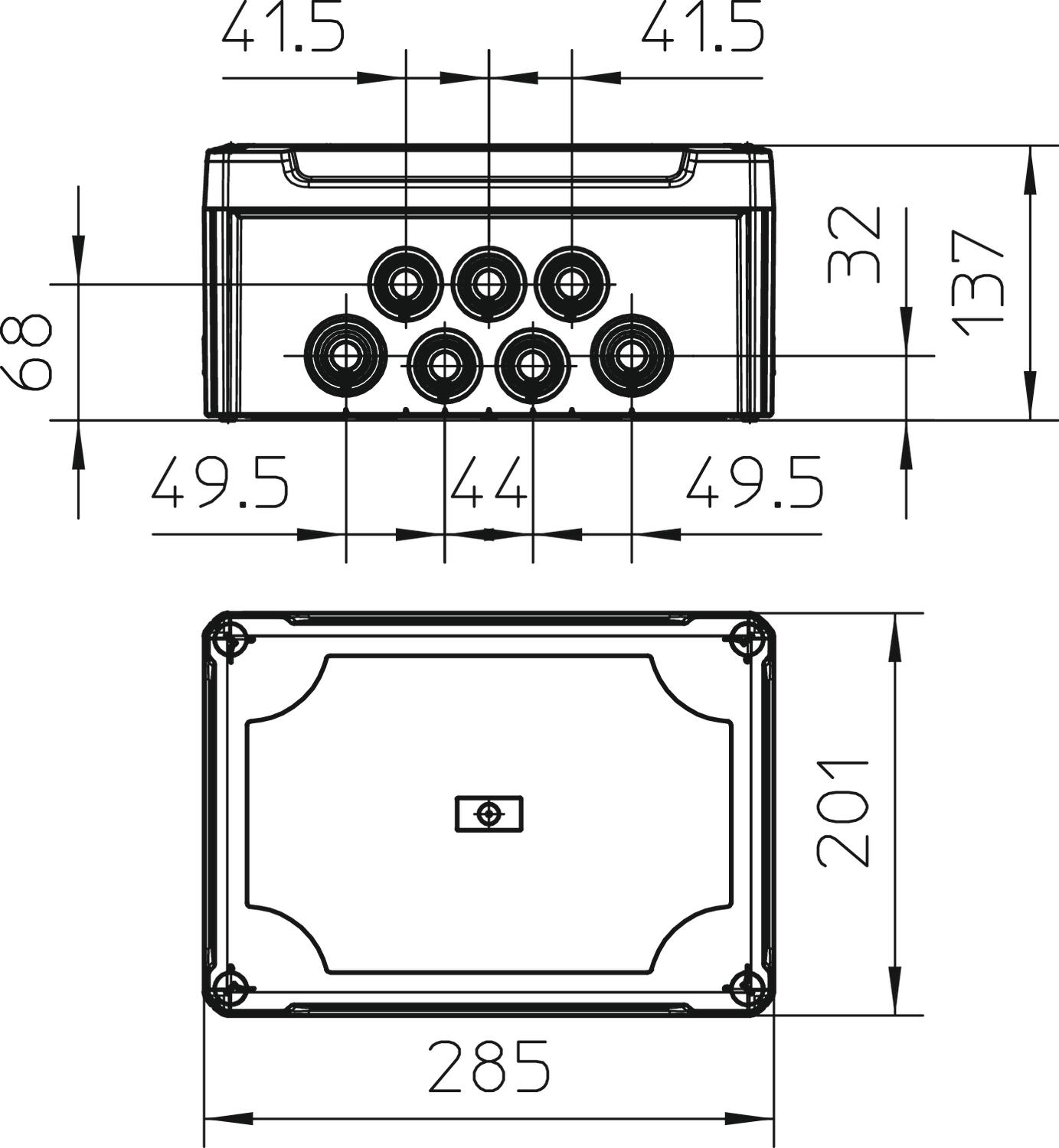 Clear internal dimensions 267x182x127 mm CO2 Footprint (GWP) Cradle-to-Gate 3,2649 kg CO2e / 1 Piece Colour Light grey; RAL 7035 Cover Transparent Cover fastening Screwed Dimension 285x201x139 Entry from rear yes Equipment Support rail Expandable yes Explosion-tested version no Fibre-glass reinforced yes Flame-resistant acc. to VDE 0471/DIN 695 Part 2-1, test temperature 650°C For Ex zone Without For Ex zone dust Without For Ex zone gas Without Halogen-free yes Height 137 mm Length 285 mm Maintain electrical functions Without Material Polypropylene / polycarbonate Measured insulation voltage Vi 500 V Mounting type Wall/ceiling mounting No. of entries 24 Nominal voltage 500 V Permitted temperature range, max. 60 °C Permitted temperature range, min. -5 °C Protection rating IP66 Protection rating IK code IK05. Sealable yes Shape Rectangular Transparent lid no Type of entry Plug-in seal Type of entry Cable Type of housing penetration Miscellaneous Weatherproof no Width 201 mm with lid yes With screening no - All types