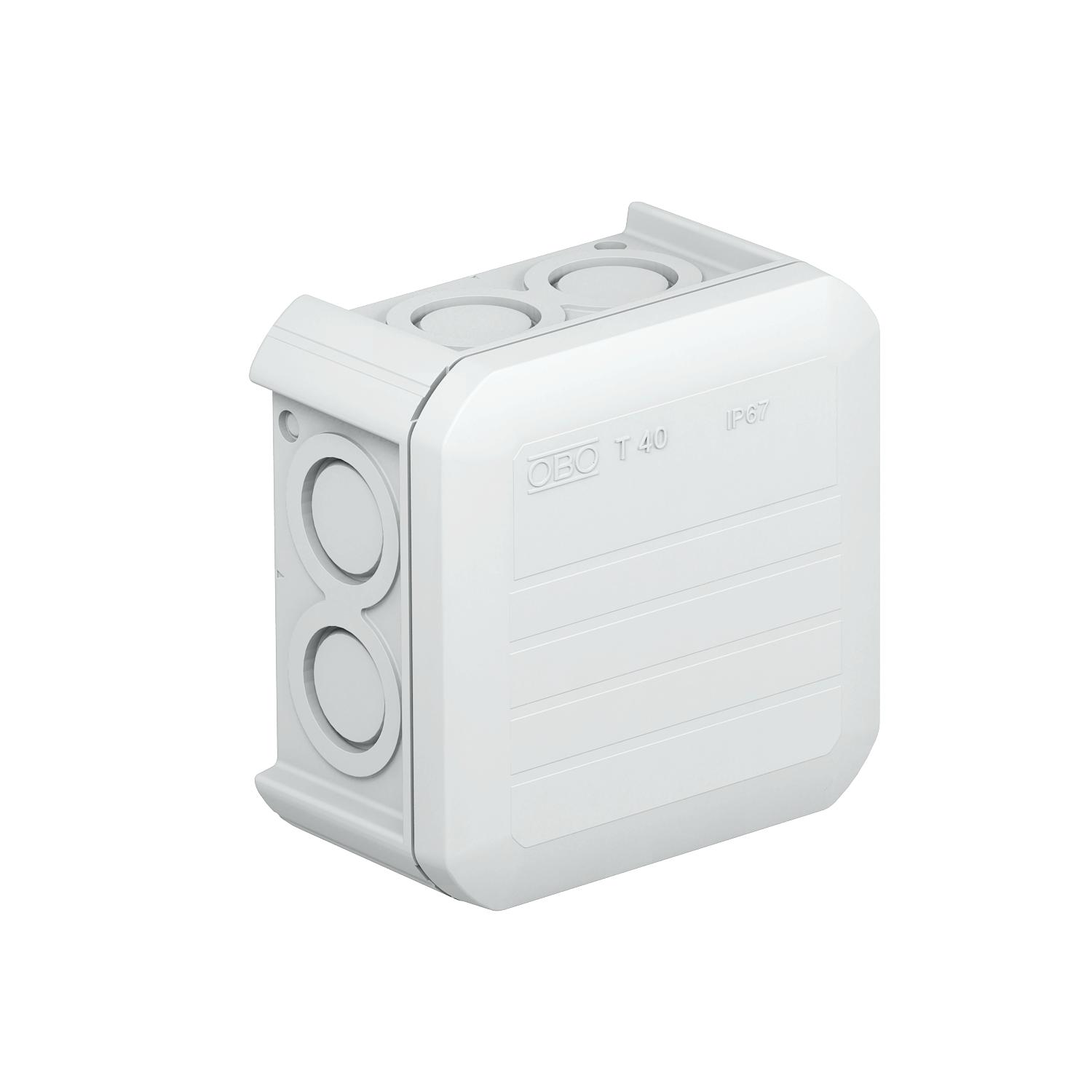 Product descriptionJunction box for the connection of cables and lines indoors and in protected outdoor areas. Square design with knock-out entries to the sides and knock-out entries in the bottom. Suitable for wall and ceiling mounting and on mounting panels. With the option to fasten inside and to mount via the corner domes. With fixed clamping cover. Made from halogen-free and UV-resistant materials. Junction box according to DIN EN 60670. Flame-resistant to DIN EN 60695/2/11, test temperature 650 °C. Impact resistance IK07 according to DIN EN 50102.