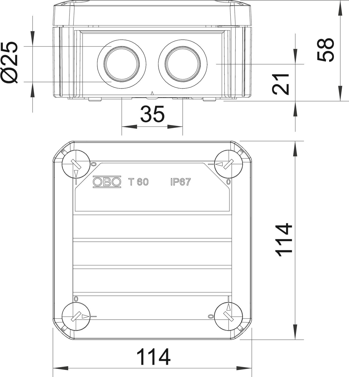 Product descriptionJunction box for the connection of cables and lines indoors and in protected outdoor areas. Square design with knock-out entries to the sides and knock-out entries in the bottom. Suitable for wall and ceiling mounting and on mounting panels. With the option to fasten inside and to mount via the corner domes. With fixed clamping cover. Made from halogen-free and UV-resistant materials.