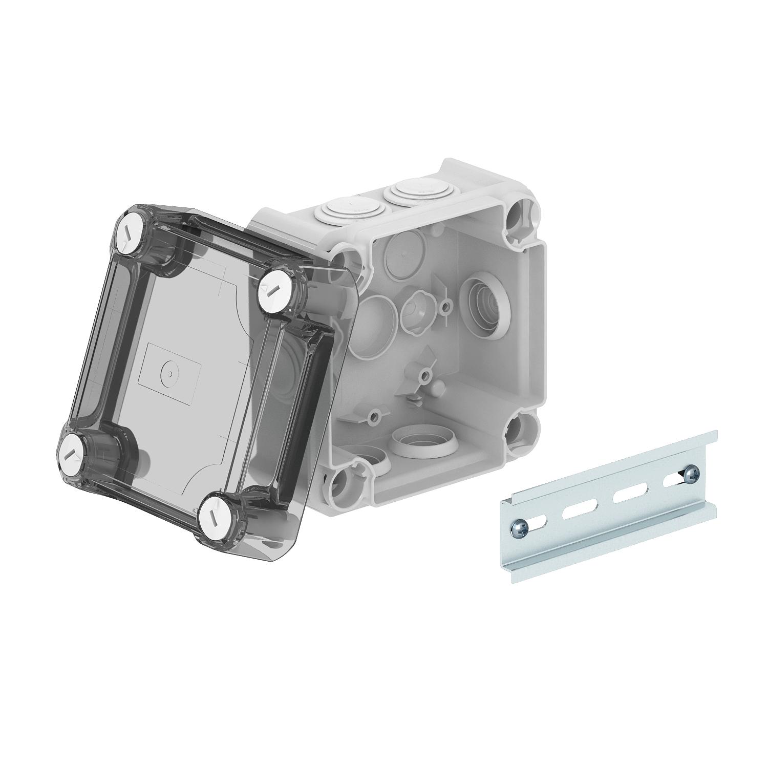 Product descriptionJunction box for the connection of cables indoors and in protected outdoor areas. Square design with plug-in seals to the sides and knock-out entries in the bottom. Suitable for wall and ceiling mounting and on mounting panels. With the option of fastening inside and to mount via the corner domes. High, transparent cover with quick lock, sealable. Made from halogen-free and UV-resistant materials.