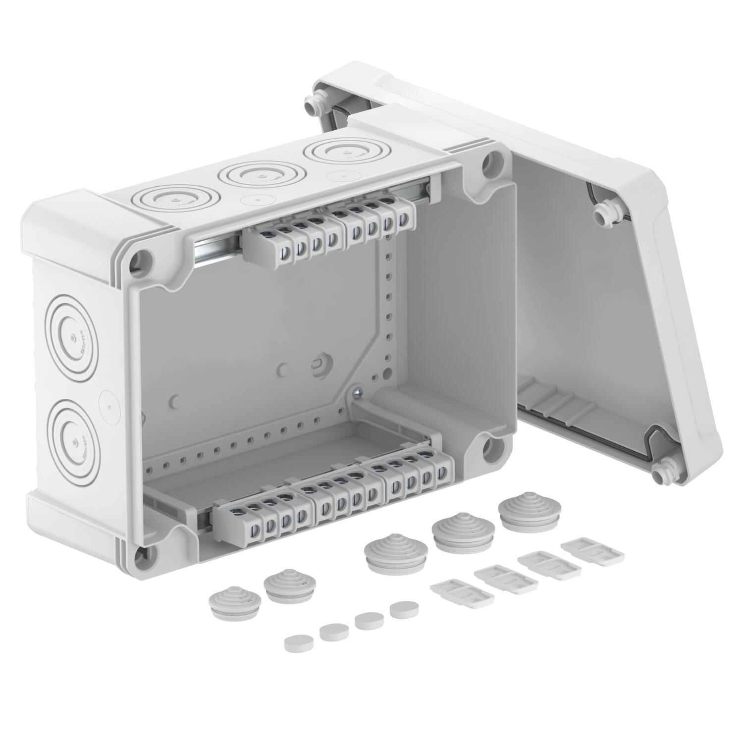 Product descriptionJunction box with terminal strip for the connection of cables and lines indoors and in outdoor areas. Rectangular design with knock-out entries. Suitable for wall and ceiling mounting with the option to fasten outside, inside or to mount via the corner domes. Particularly impact resistant with IK09. Cover with quick lock, sealable. Made from halogen-free and UV-resistant materials.