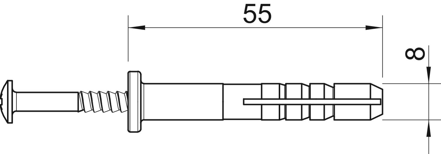 Colour Light grey Diameter 8 mm Dimension 8x55mm Drill hole depth 60 mm Halogen-free yes Length 55 mm Material Polyamide Pull-out force 350 N Screw system Pozidrive PZ With bolts yes - All types
