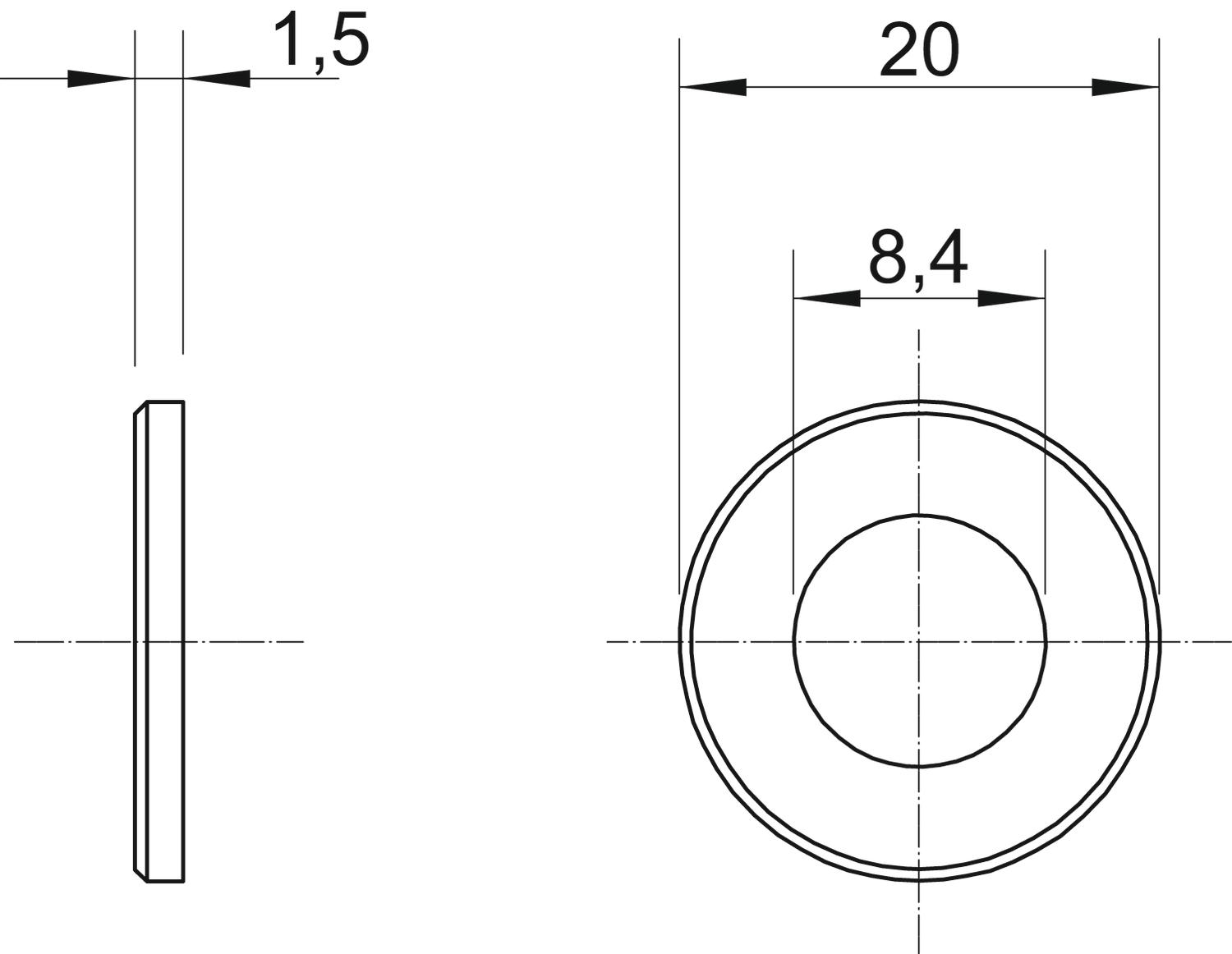 CO2 Footprint (GWP) Cradle-to-Gate 0,0117 kg CO2e / 1 Piece Dimension M8,Ø20mm Dimension d 8,4 mm Dimension d max. 20 mm Dimension d min. 20 mm Dimension h 1,5 mm Halogen-free yes Material Stainless steel Material thickness 1,5 mm Surface Bright, treated Thread M8 - All types