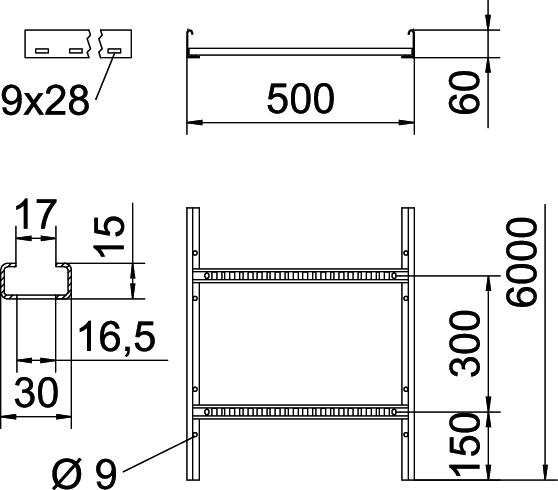 Product descriptionCable ladder with a 60 mm side height with welded C30 profile rungs which are open in an upwards direction. Rolled side rail for reinforcement and as edge protection. Fastening to the bracket takes place using hold-down clamps, type LKS 40. The slot dimension of the rung is 16.5 mm and the appropriate clamp clip is type 2056.