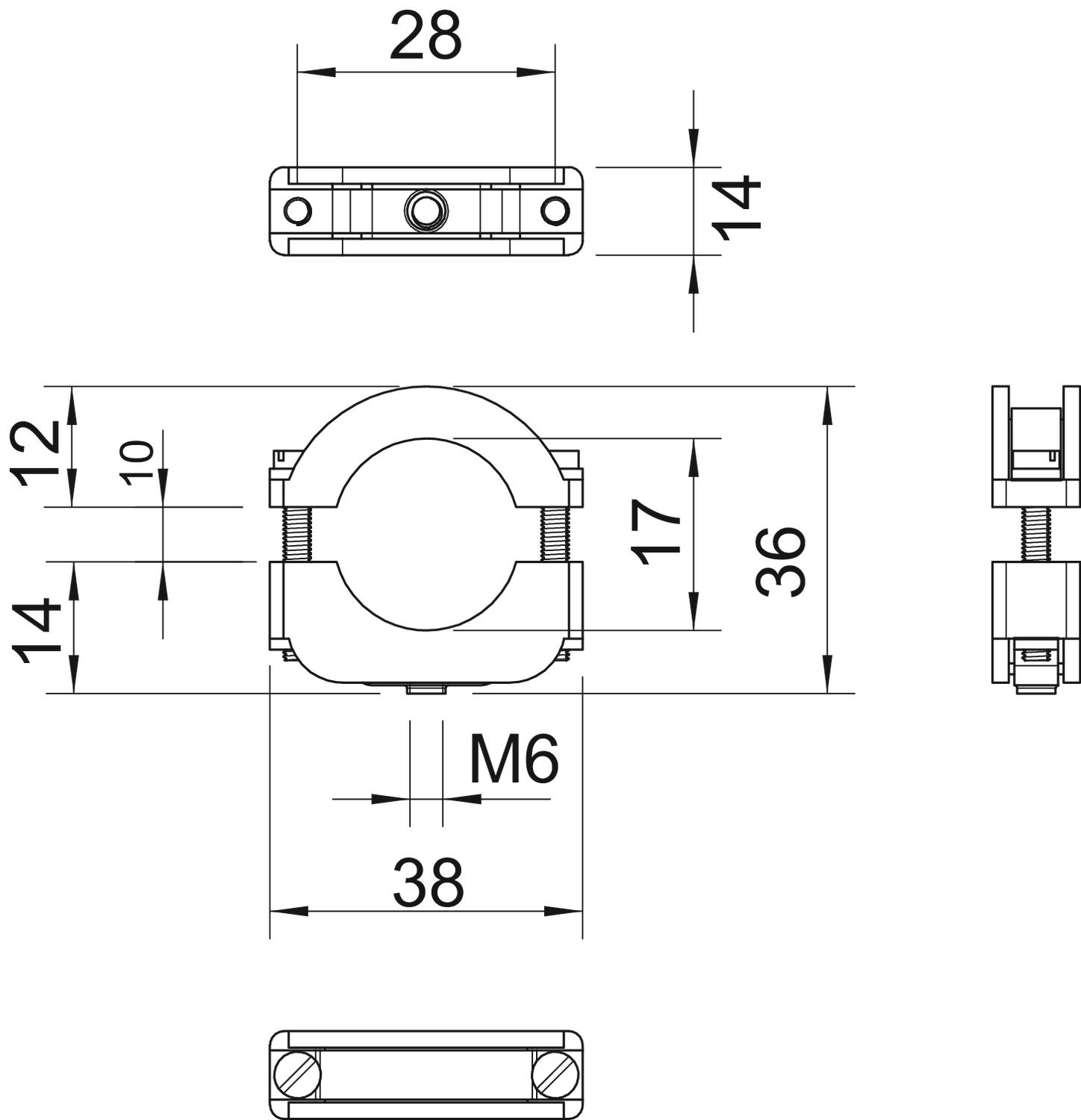Bolt M4 x 25 Clamping range D, max. 17 mm Clamping range D, min. 10 mm CO2 Footprint (GWP) Cradle-to-Gate 0,0649 kg CO2e / 1 Piece Colour Light grey; RAL 7035 Dimension 10-17mm Dimension A 38 mm Dimension B 28 mm Dimension b 14 mm Dimension D 17 mm Dimension H 36 mm Dimension Ho (mm) 12 Dimension Hu (mm) 14 Dimension l 25 mm Dimension x 7 mm Fastening type Threaded connection Halogen-free yes Material Polystyrene Number of cables/pipes 1 Plastic-covered no Suitable in fire protection area no UV-resistant no Version for Closed - All types