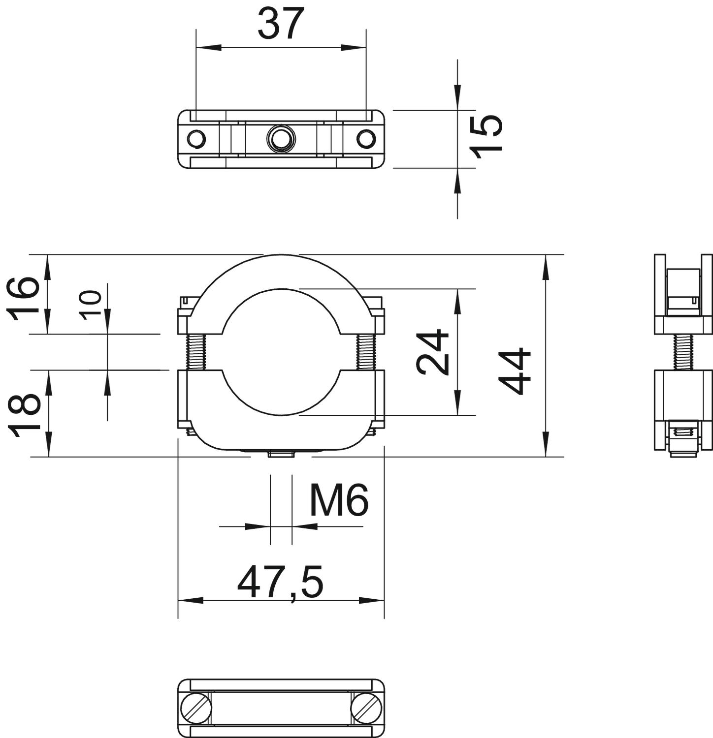 Bolt M4 x 30 Clamping range D, max. 24 mm Clamping range D, min. 17 mm CO2 Footprint (GWP) Cradle-to-Gate 0,08 kg CO2e / 1 Piece Colour Light grey; RAL 7035 Dimension 17-24mm Dimension A 47,5 mm Dimension b 15 mm Dimension B 37 mm Dimension D 24 mm Dimension H 44 mm Dimension Ho (mm) 16 Dimension Hu (mm) 18 Dimension l 30 mm Dimension x 8 mm Fastening type Threaded connection Halogen-free yes Material Polystyrene Number of cables/pipes 1 Plastic-covered no Suitable in fire protection area no UV-resistant no Version for Closed - All types