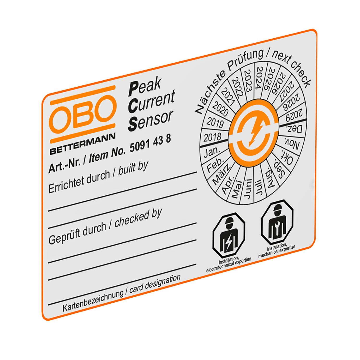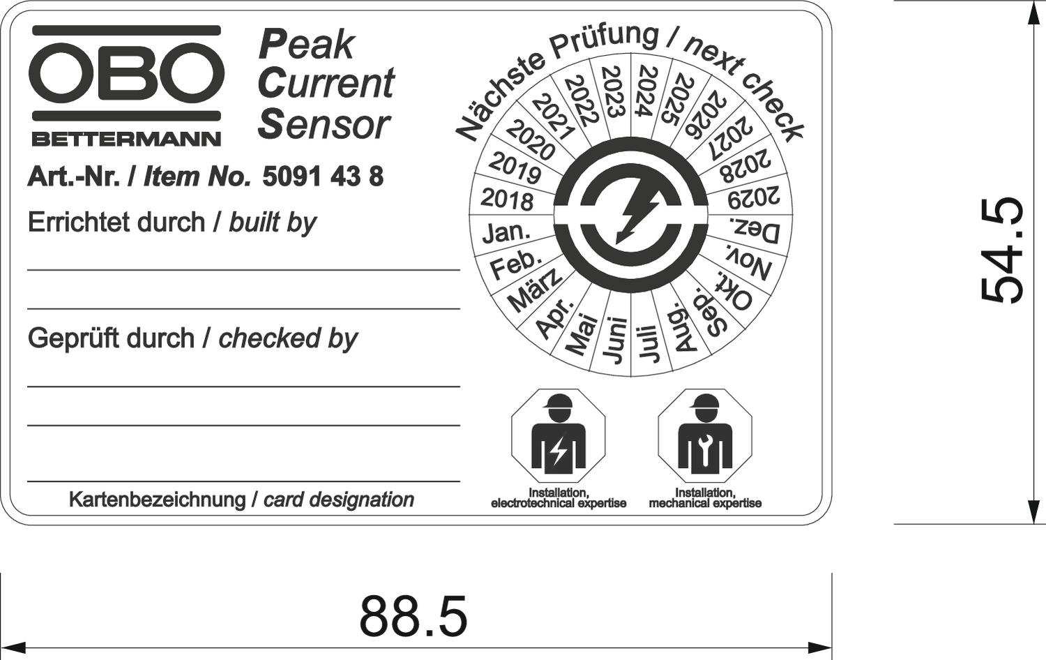 Product descriptionPeak Current Sensor (PCS) card for recording pulsed/lightning currents. A continuous check of whether lightning has struck the lightning protection system and how high the most recent lightning current was in kA can be carried out easily by the system operator, a specialist lightning protection company or by a surveyor. Here, the printed maintenance circuit and the labelling panels support the maintenance work of the entire lightning protection system, which must be performed at defined intervals according to VDE 0185-305-3 (IEC/EN 62305-3).