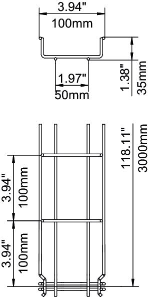 CO2 Footprint (GWP) Cradle-to-Gate 0,9521 kg CO2e / 1 Meter Colour zinc Connector version Integrated connector Dimension 35x100x3000 Dimension B 100 mm Height 35 mm Height 1 in Integrated partition Without Length 3000 mm Load test type according to IEC 61537 Type II Maintain electrical functions no Material Steel Profile shape U-shaped Rustproof steel, pickled no Screwless connector yes Support spacing 1.0 m 0,25 kN/m Support spacing 1.5 m 0,11 kN/m Support spacing 2.0 m 0,1 kN/m Surface Electrogalvanized Type of connector, cable support system Click fastening Usable cross-section 23 cm² Usable cross-section 3500 mm² Wide-span version no Width 100 mm Width 3,94 in Wire diameter 3,9 mm Technical data
