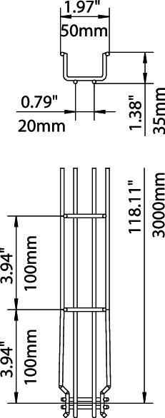 CO2 Footprint (GWP) Cradle-to-Gate 0,8706 kg CO2e / 1 Meter Colour zinc Connector version Integrated connector Dimension 35x50x3000 Dimension B 52 mm Height 1 in Height 35 mm Integrated partition Without Length 3000 mm Load test type according to IEC 61537 Type II Maintain electrical functions no Material Steel Profile shape U-shaped Rustproof steel, pickled no Screwless connector yes Support spacing 1.0 m 0,25 kN/m Support spacing 1.5 m 0,11 kN/m Support spacing 2.0 m 0,1 kN/m Surface Electrogalvanized Type of connector, cable support system Click fastening Usable cross-section 9,4 cm² Usable cross-section 1750 mm² Wide-span version no Width 1,97 in Width 50 mm Wire diameter 3,9 mm Technical data