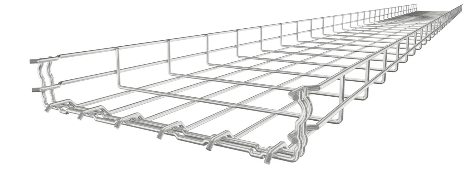 No additional connection components are required for the mesh cable tray, it is simply interlocked. The grid width is 50 x 100 mm (exception: GRM 55/50 = 20 x 100 mm).