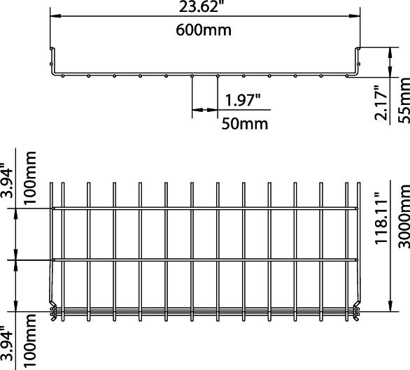 No additional connection components are required for the mesh cable tray, it is simply interlocked. The grid width is 50 x 100 mm (exception: GRM 55/50 = 20 x 100 mm).