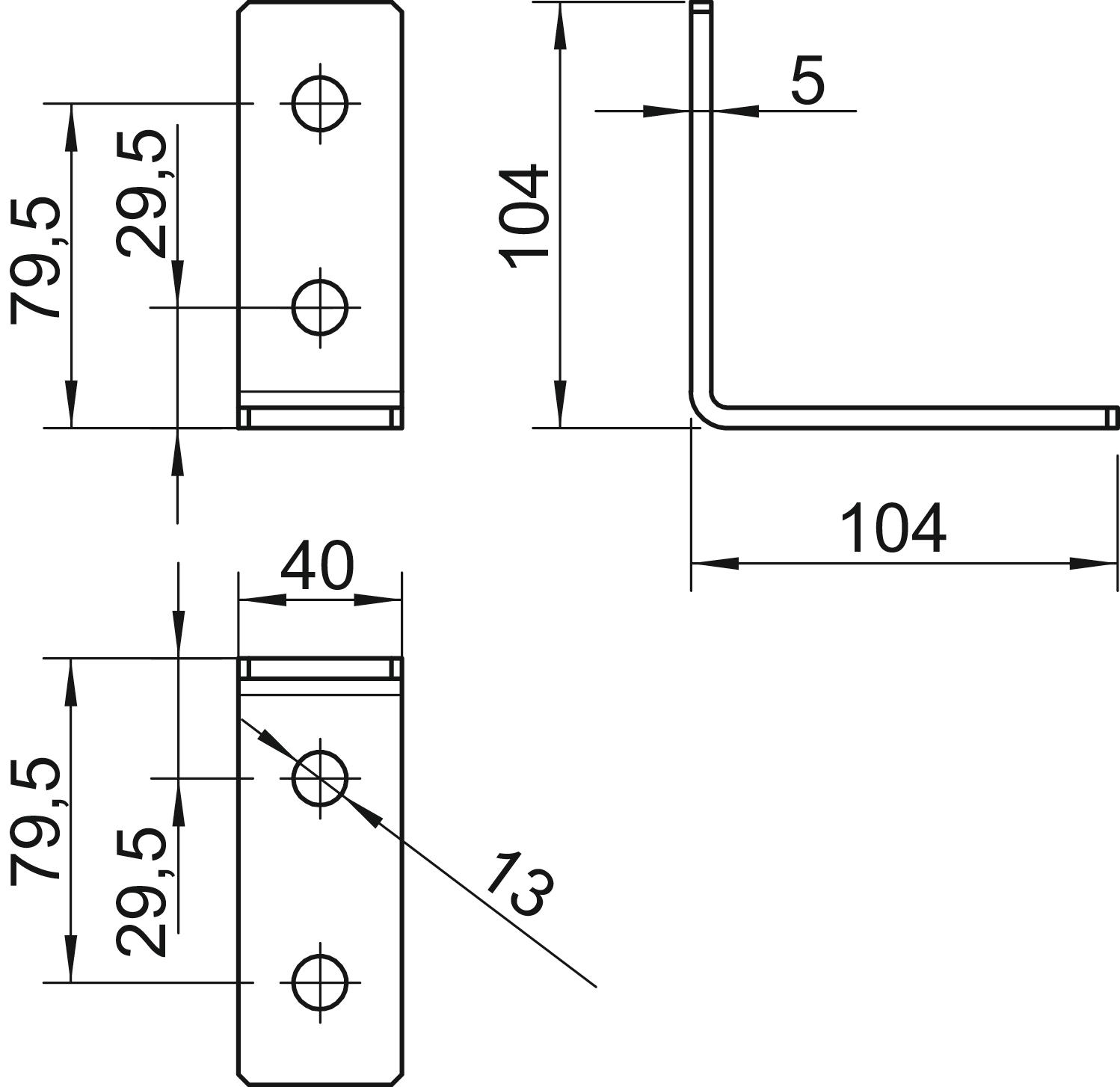 CO2 Footprint (GWP) Cradle-to-Gate 1,6062 kg CO2e / 1 Piece Dimension 104x104x40x4 Height 104 mm Hole size 13 mm Length 104 mm Material Stainless steel 1.4301 Material thickness 4 mm Rustproof steel, pickled no Suitable for profile shapes C profile Surface Bright, treated Version for 90° angle Width 40 mm With screw accessories no - All types