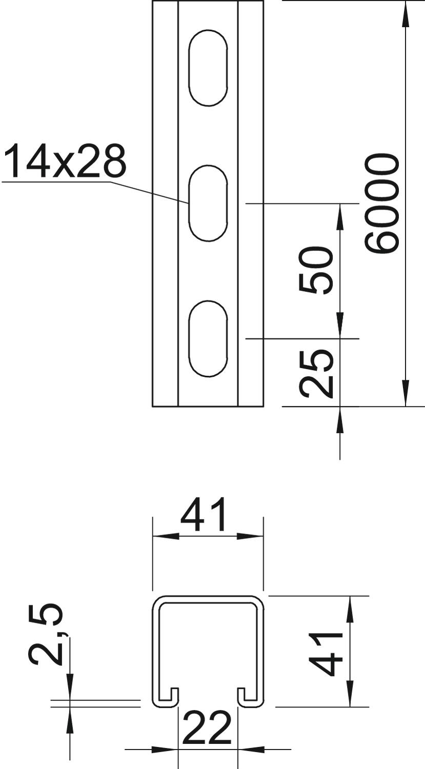 Breakable no CO2 Footprint (GWP) Cradle-to-Gate 12,578 kg CO2e / 1 Meter Dimension 6000x41x41 Dimension L 6000 mm Drill hole spacing, centre 50 mm Height 41 mm Hole size 14x28 mm Length 6000 mm Maintain electrical functions no Material Stainless steel 1.4571 Material thickness 2,5 mm Profile shape C profile Slot width 22 mm Static value A 2,97 cm² Static value ly 6,05 cm⁴ Static value lz 9,01 cm⁴ Static value Wy 2,91 cm³ Static value Wz 4,4 cm³ Surface Bright, treated Type of perforation Perforated back Version for Single profile Width 41 mm With toothing yes - All types