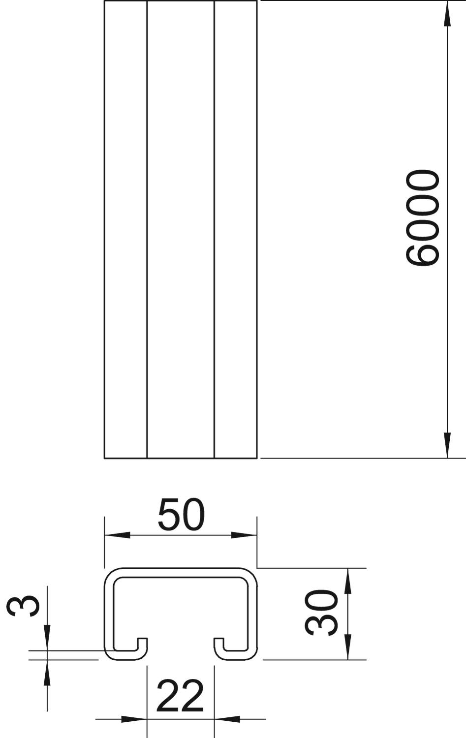 Breakable no CO2 Footprint (GWP) Cradle-to-Gate 6,0649 kg CO2e / 1 Meter Dimension 6000x50x30 Dimension L 6000 mm Height 30 mm Length 6000 mm Maintain electrical functions no Material Steel Material thickness 3 mm Profile shape C profile Slot width 22 mm Static value A 1,74 cm² Static value ly 1,19 cm⁴ Static value lz 4,46 cm⁴ Static value Wy 1,05 cm³ Static value Wz 2,23 cm³ Surface Hot-dip galvanised Type of perforation Without Version for Single profile Width 50 mm With perforation no With toothing no - All types