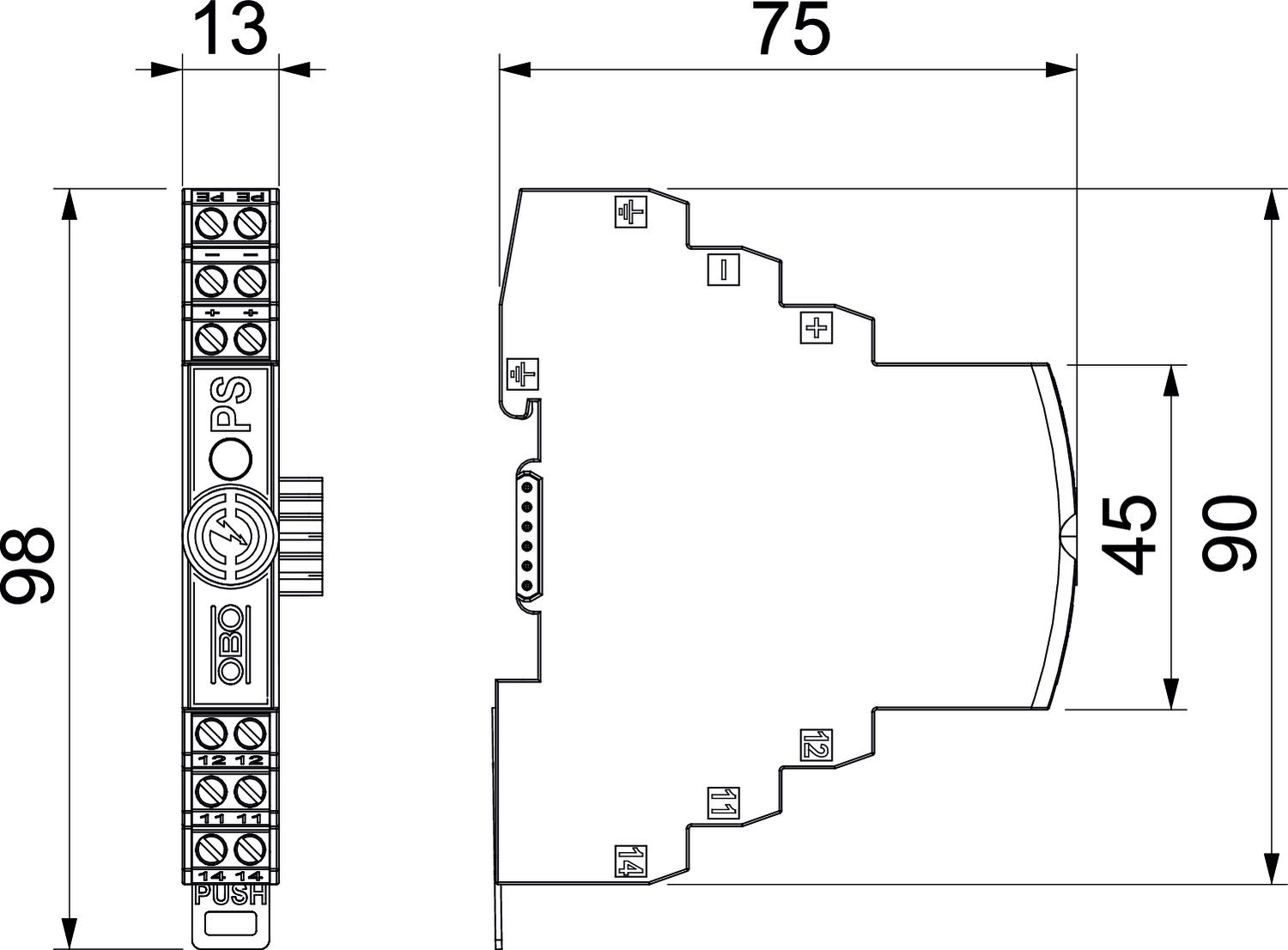 CO2 Footprint (GWP) Cradle-to-Gate 0,297 kg CO2e / 1 Piece Connection cross-section, flexible, max. 1,5 mm² Connection cross-section, flexible, min. 0,14 mm² Connection cross-section, multi-wire, max. 2,5 mm² Connection cross-section, multi-wire, min. 0,14 mm² Connection cross-section, rigid, max. 2,5 mm² Connection cross-section, rigid, min. 0,14 mm² Dimension 5V Earthing via: Connection cable Height 98 mm Length 75 mm Mounting of input / output Screw terminals Permitted temperature range, max. 80 °C Permitted temperature range, min. -40 °C Protection rating IP20 Shielding connection available no Signalling on device Visual Telecommunications contact yes Width 13 mm - All types