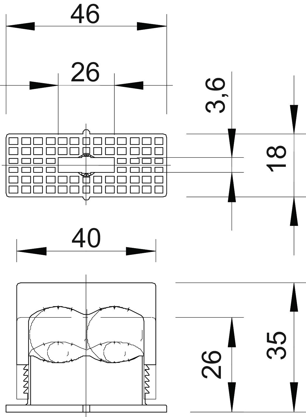 Clamping range D, max. 16 mm Clamping range D, min. 6 mm CO2 Footprint (GWP) Cradle-to-Gate 0,0346 kg CO2e / 1 Piece Colour Light grey; RAL 7035 Dimension 6-16mm Dimension a 46 mm Dimension a1 (mm) 26 mm Dimension b 18 mm Dimension b1 3,8 mm Dimension c 40 mm Dimension d 26 mm Dimension e 35 mm Expandable no Fastening type Screw hole Halogen-free yes Impact-resistant yes Material Polystyrene Number of cables/pipes 2 - All types