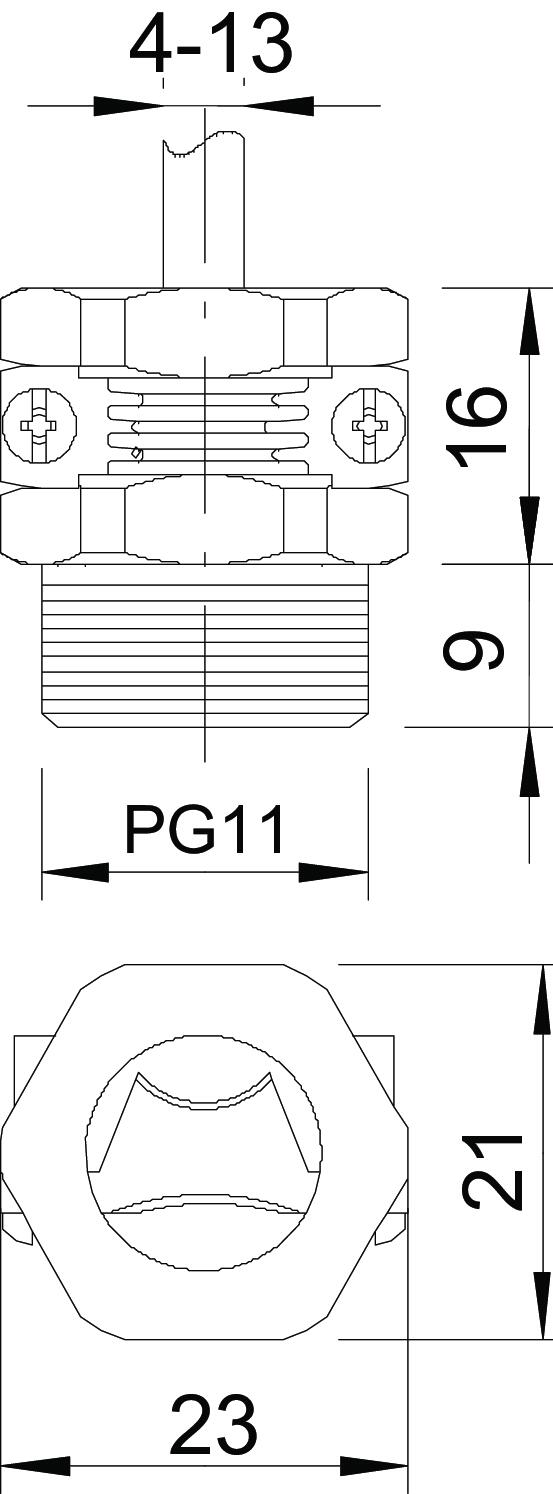Clamping range, max. 13,3 mm Clamping range, min. 4 mm CO2 Footprint (GWP) Cradle-to-Gate 0,0247 kg CO2e / 1 Piece Colour Light grey; RAL 7035 Dimension PG11 Dimension E 23 mm Dimension L1 9 mm Dimension L2 16 mm Fibre-glass reinforced no Halogen-free yes Impact-resistant no Material Polyamide Nominal thread size 11 Strain relief option yes Thread increase 1,41 mm Thread type PG WAF 21 - All types
