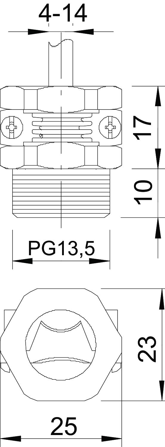 Clamping range, max. 14,3 mm Clamping range, min. 4,1 mm CO2 Footprint (GWP) Cradle-to-Gate 0,0364 kg CO2e / 1 Piece Colour Light grey; RAL 7035 Dimension PG13,5 Dimension E 25 mm Dimension L1 10 mm Dimension L2 17 mm Fibre-glass reinforced no Halogen-free yes Impact-resistant no Material Polyamide Nominal thread size 13,5 Strain relief option yes Thread increase 1,41 mm Thread type PG WAF 23 - All types