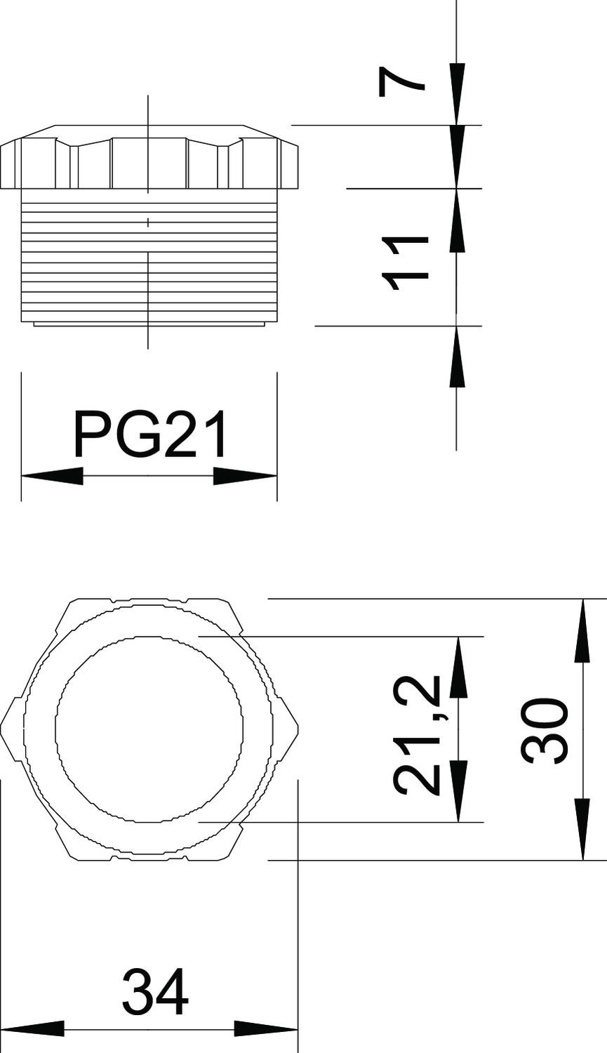 CO2 Footprint (GWP) Cradle-to-Gate 0,0411 kg CO2e / 1 Piece Colour Light grey; RAL 7035 Dimension PG21 Dimension D 21,2 mm Dimension L1 17 mm Dimension L2 7 mm Fibre-glass reinforced no Halogen-free yes Impact-resistant yes Material Polyamide Nominal thread size 21 Strain relief option no Thread type PG WAF 30 - All types