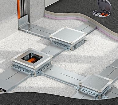 Cable routing and underfloor systems for administrative and functional buildings including architectural solutions