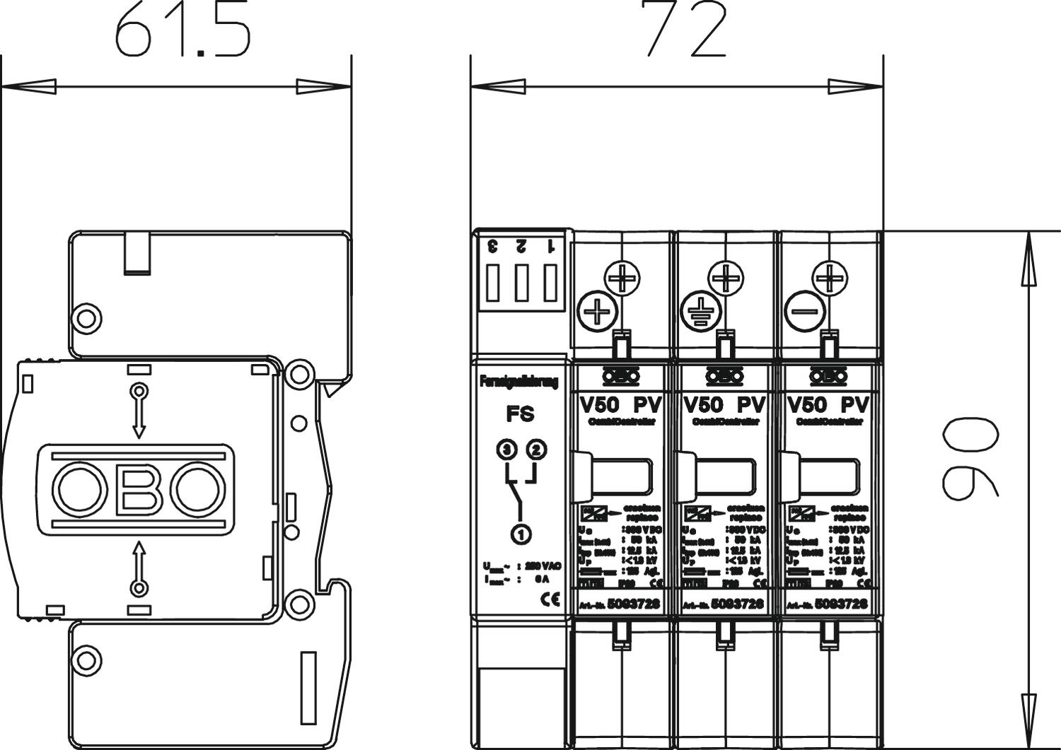 Product descriptionV50 combination arrester, type 1+2, for PV systems with FS contact as potential-free changeover