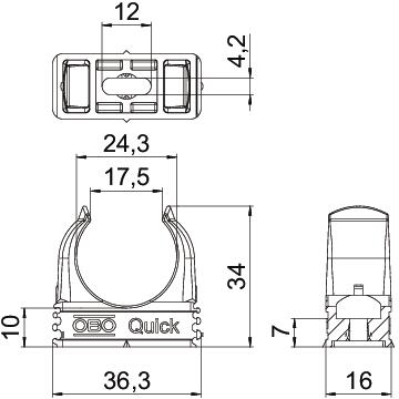 Product descriptionFlush-mounted clip to accept metric steel armoured pipes and heavy-duty insulating pipes, as well as Quick-Pipe® electrical installation pipes. Universal fastening options on walls and ceilings, both in indoor and protected outdoor areas. With slot for side alignment during mounting with wood screw or knock-in anchor. Toolless pipe mounting. Can also be arranged with OBO Multi-Quick or proQuick clip. M16 - M32 size can be screwed onto M6 thread. Recommended fastening spacing 50–60 cm, for max. extraction values F at a room temperature of 20 °C, see the table.