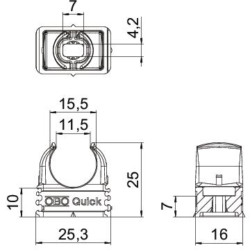 Product descriptionFlame-resistant, flush-mounted clip to accept metric steel armoured pipes and heavy-duty insulating pipes, as well as Quick-Pipe® electrical installation pipes. Universal fastening options on walls and ceilings, both in indoor and protected outdoor areas. With slot for side alignment during mounting with wood screw or knock-in anchor. Toolless pipe mounting. Can also be arranged with OBO Multi-Quick or proQuick clip. M16 - M32 size can be screwed onto M6 thread. Recommended fastening spacing 50–60 cm, for max. extraction values F at a room temperature of 20 °C, see the table.