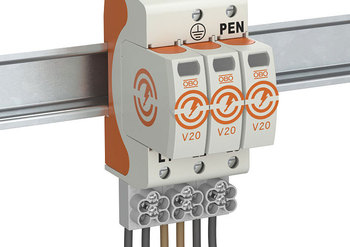 Now the connection of cables with a cross-section of up to 1.5 mm² works without difficulty. A connection point can accept up to three cables and can be connected to the surge arrestor. In this way, the connection terminals facilitate an EMV-optimal through-wiring to DIN VDE 0100-534 of lightning current and surge arrestors of up to a maximum nominal current of 50 A.