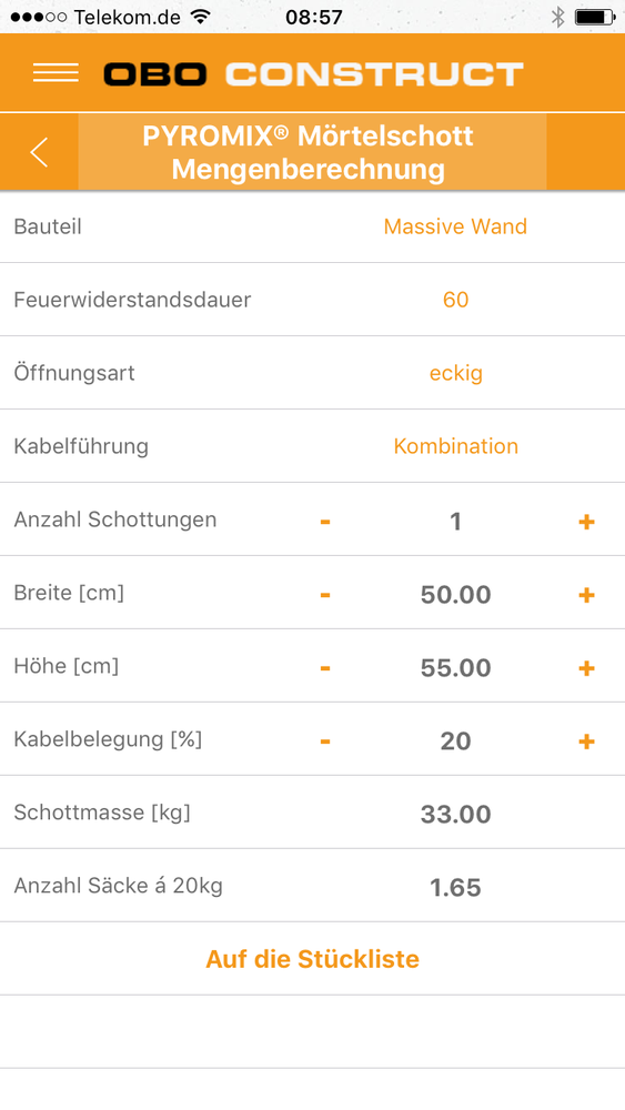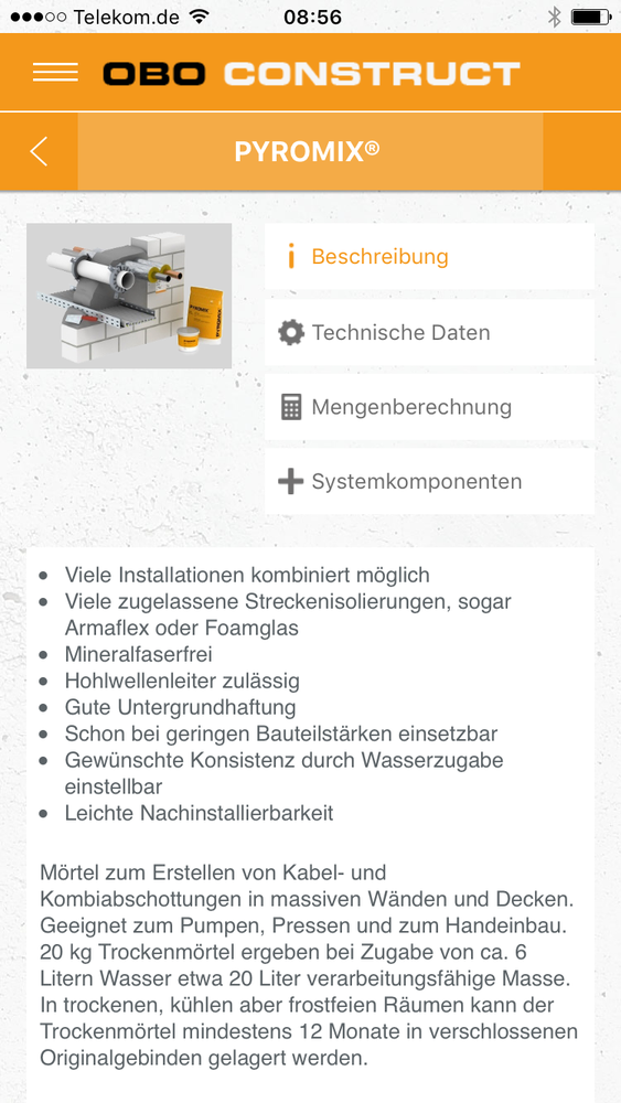 Using the app, you can determine suitable products for your current requirements, quickly and simply. Intelligent searches guide you, step by step, to the right products and can determine the necessary fire protection material. You can then add the necessary products and other accessories easily to a pick list and send it via e-mail.