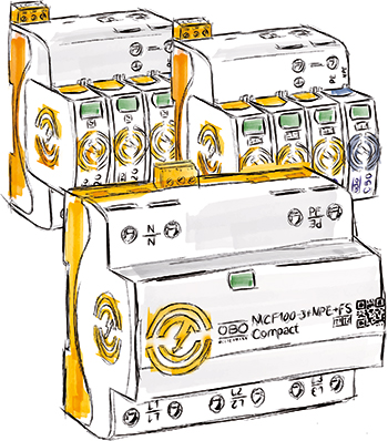 The strongest items in the team, the combination arrestors MCF Compact 75 and 100, which were developed for universal use in buildings of lightning protection classes I–IV, have a total arresting capacity of up to 100 kA (25 kA/pin). The devices are used in buildings with external lightning protection or overhead line supply. Besides offices, commercial real estate and residential buildings, these surge protection devices are also particularly suitable for industry. The combination arrestors are available in 3-pin (TNC network) and 3+1-pin (TT and TNS network) versions. They are installed at the supply point of the building and offer system protection up to 315 A without a separate back-up fuse and are short-circuit-protected up to a line follow current of 50 kA. With a width of just 105 mm, the devices have a compact structure and, in comparison to standard devices, are around 25% smaller and are thus more space-saving and easier to insert in the supply/in the switchgear cabinet.